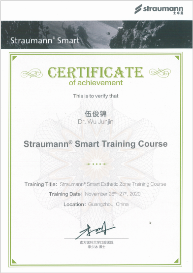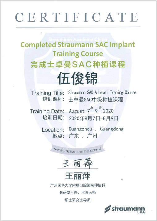 伍俊錦醫(yī)生,畢業(yè)于長(zhǎng)沙醫(yī)學(xué)院口腔醫(yī)學(xué)專業(yè),曾在佛山市暨南大學(xué)附屬口腔醫(yī)院口腔科實(shí)習(xí),師從南方醫(yī)科大學(xué)口腔醫(yī)院種植科李少冰博士。曾參加北京口腔種植培訓(xùn)學(xué)院(BITC)教育周培訓(xùn),士卓曼種植大師之路培訓(xùn)并完成士卓曼SAC種植課程,以及口腔顯微根管治療四手操作培訓(xùn)并完成系統(tǒng)規(guī)范化課程及實(shí)踐操作。多次受邀參加國(guó)內(nèi)大型專業(yè)種植論壇會(huì)議,如第二屆粵港澳大灣區(qū)種植論壇暨第七次BITC口腔種植青年學(xué)者論壇、暨南大學(xué)口腔種植修復(fù)論壇等。